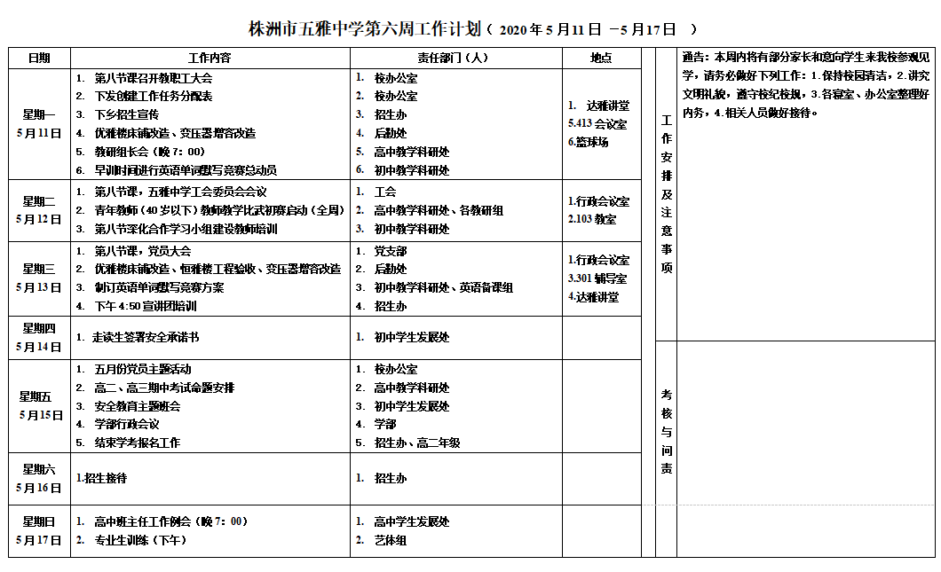 株洲市五雅中學(xué)第六周工作計(jì)劃